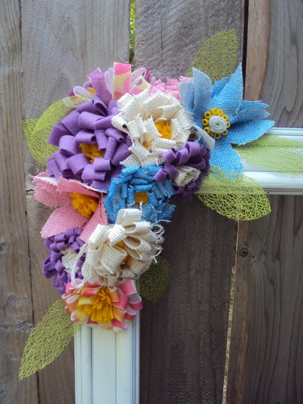As I said I made all different styles and colors using burlap and felt. I also changed up the sizes from the original directions Amy gave. And I glued them on a Goodwill frame, added some leaves out of this cool ribbon I found.